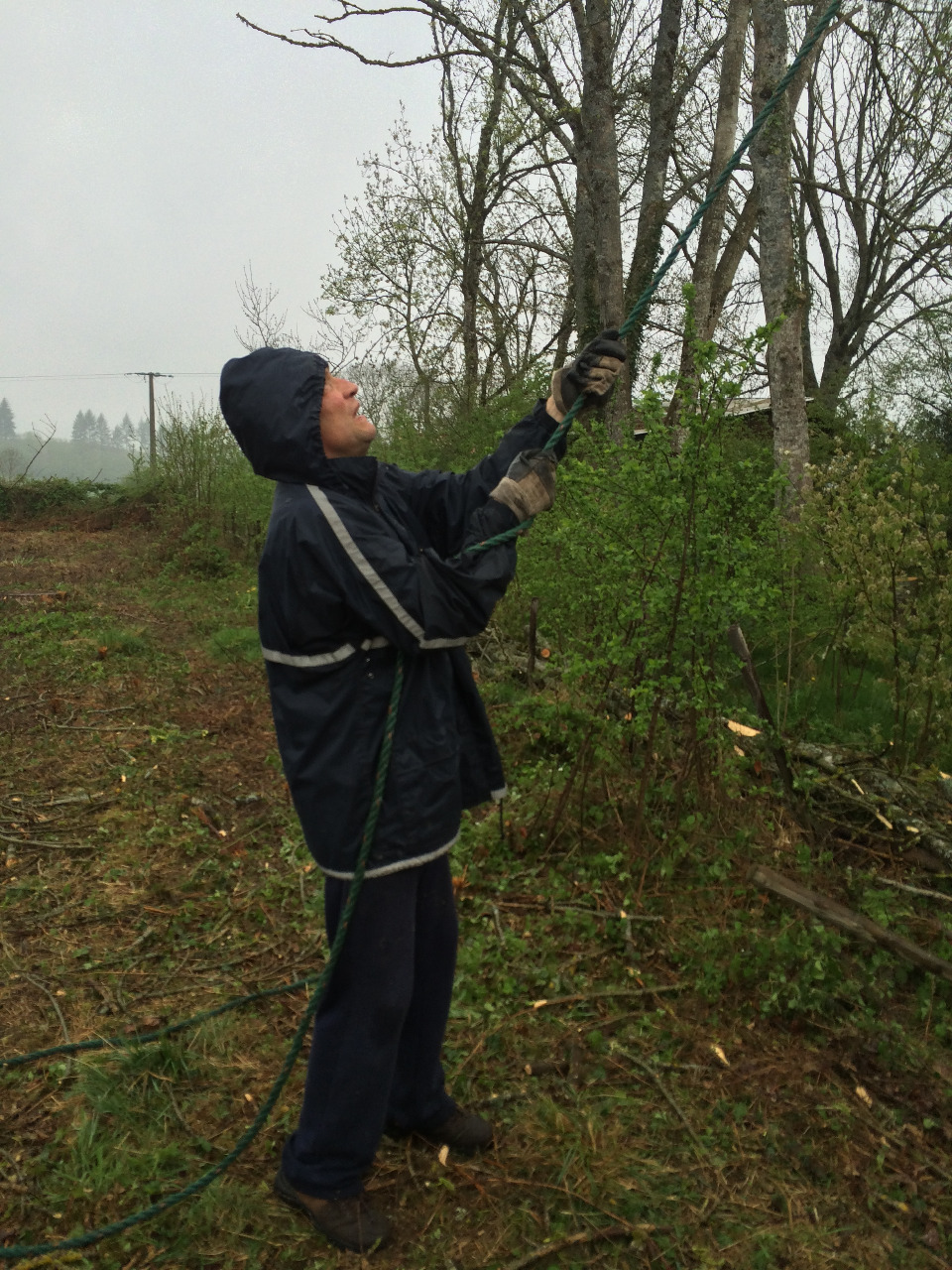 Dus ging de zaag er in. En dat was spannender dan het leek. Stammen van 40 cm doorsnee en 1 meter lang wil je niet graag op je dak krijgen als ze afgezaagd worden (laat staan op je hoofd). In de stromende regen moesten eerst de takken veilig worden verwijderd, wat de nodige hoofdbrekers kostten.