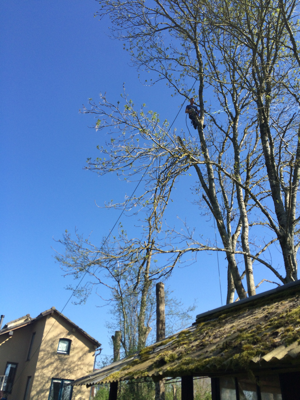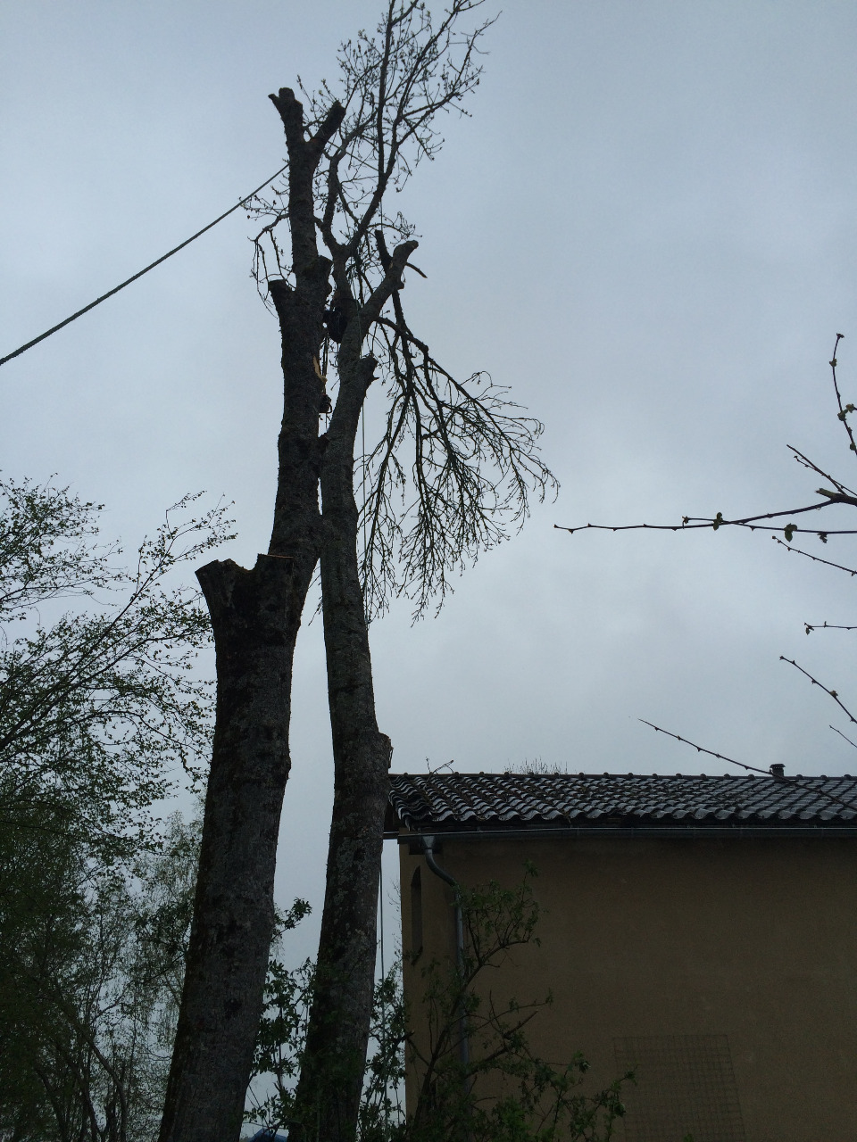 Het heeft lang geduurd, maar afgelopen weekeind hebben we dan toch eindelijk de grootste en gevaarlijkste bomen bij ons huis een kopje kleiner gemaakt. Met vakkundige hulp van bomenspecialist John en neef Jielis zijn vier (te) zware jongens van takken ontdaan en al een flink stuk ingekort.